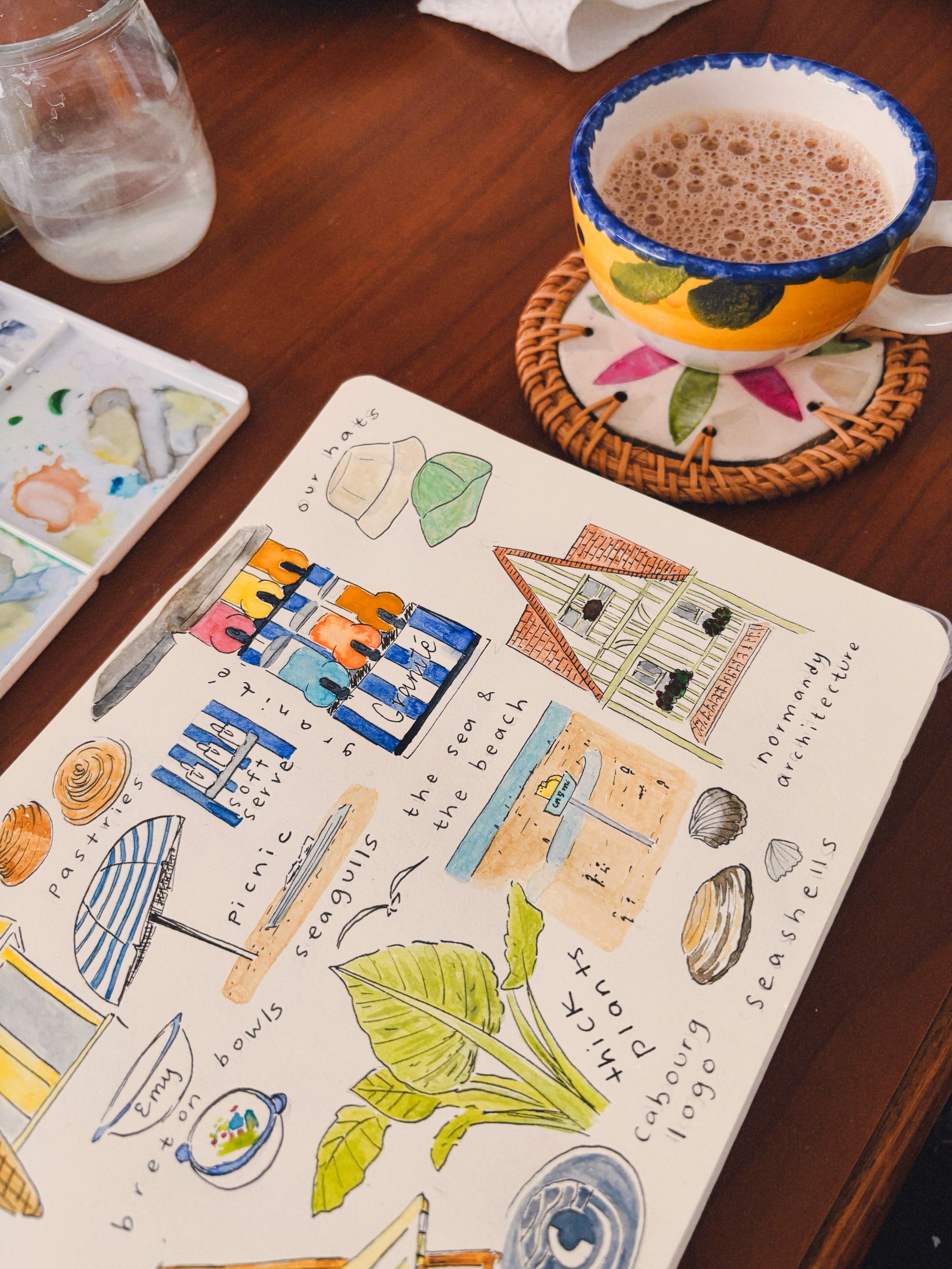 A sketchbook with colorful illustrations of beach scenes, umbrellas, and seashells, along with handwritten notes. A cute thrifted cup with hot tea to accompany.